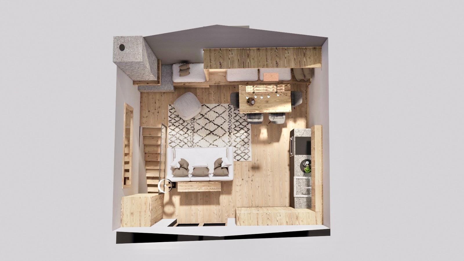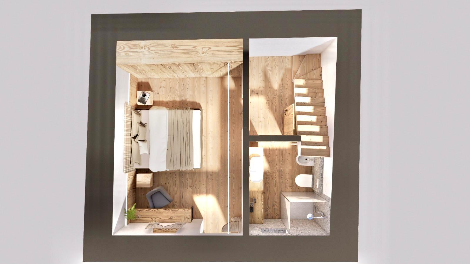 L’immobile si sviluppa su due piani: a piano terra zona notte con ampia camera da letto di 16mq; bagno completo di doccia, wc e bidet; sottoscala che funge da rispostiglio; a primo piano zona giorno con cucina e salotto uniti che regalano uno spazio largo e confortevole. Entrambi i piani hanno un accesso indipendente, ma sono collegati internamente da un comodo giroscale. Tutti gli ambienti sono ricchi di luce naturale, amplificata dalle finiture in legno che contribuiscono ad apportare calore al rustico unitamente a un’atmosfera tradizionale di fusione con la natura circostante.