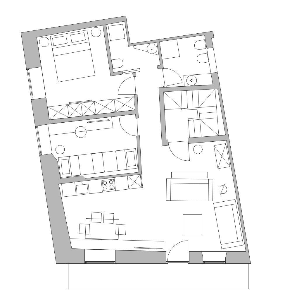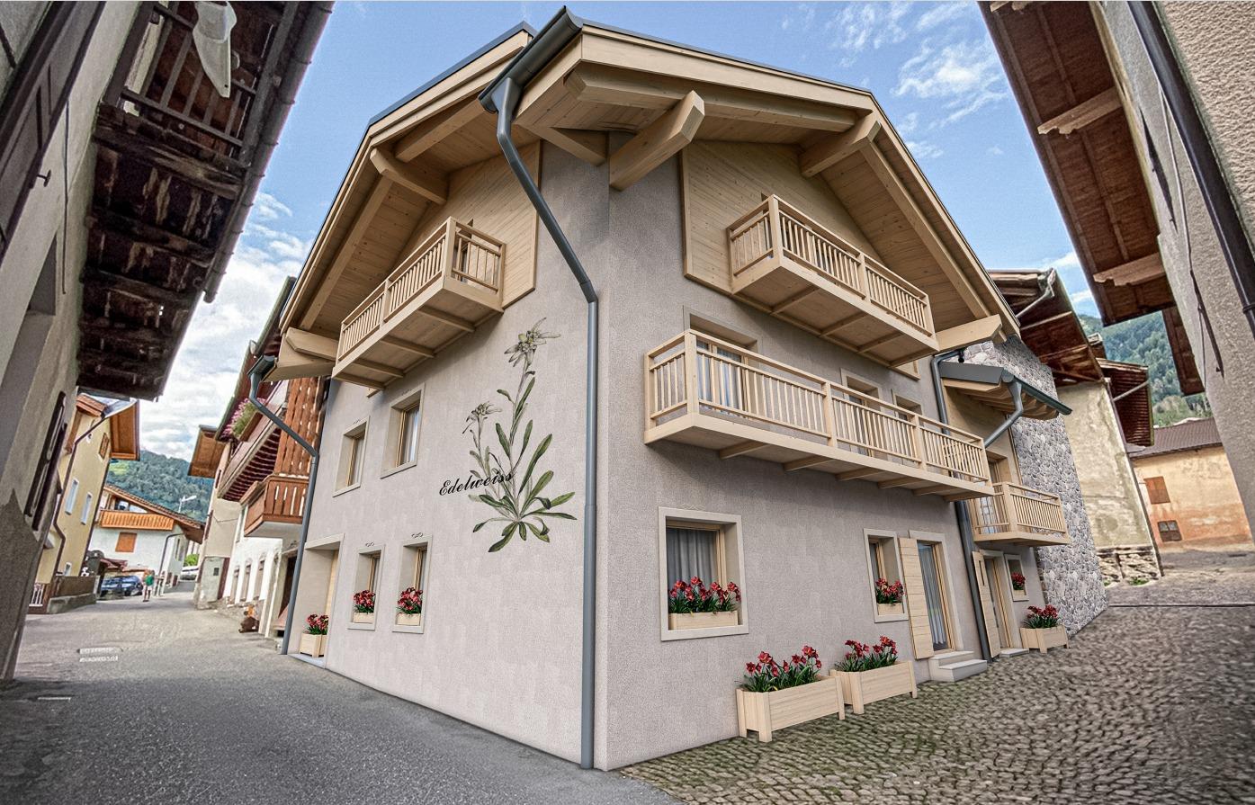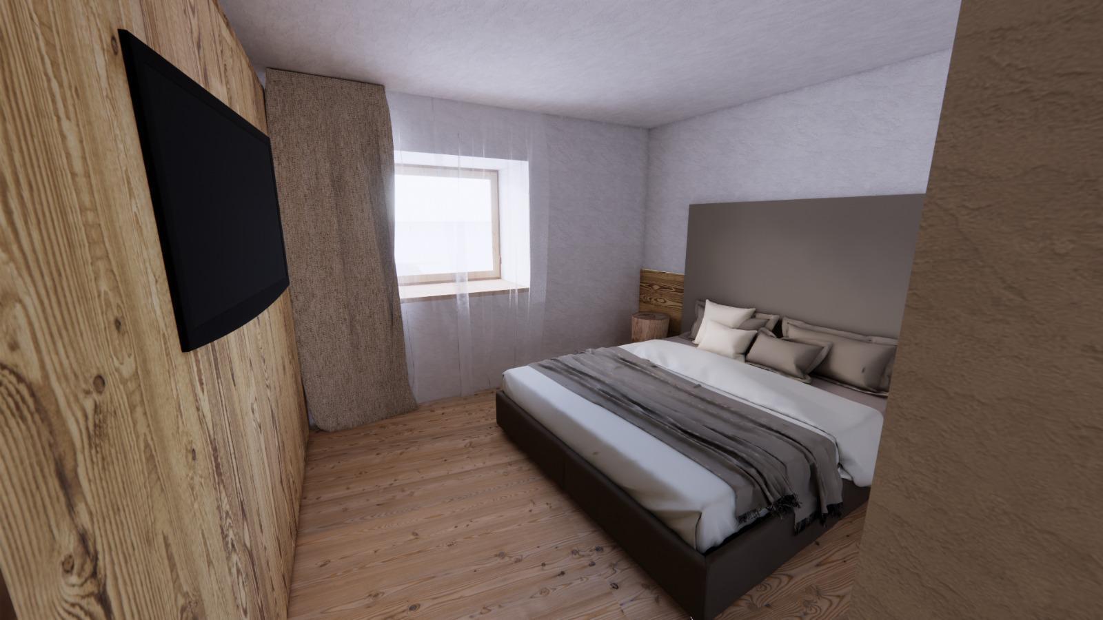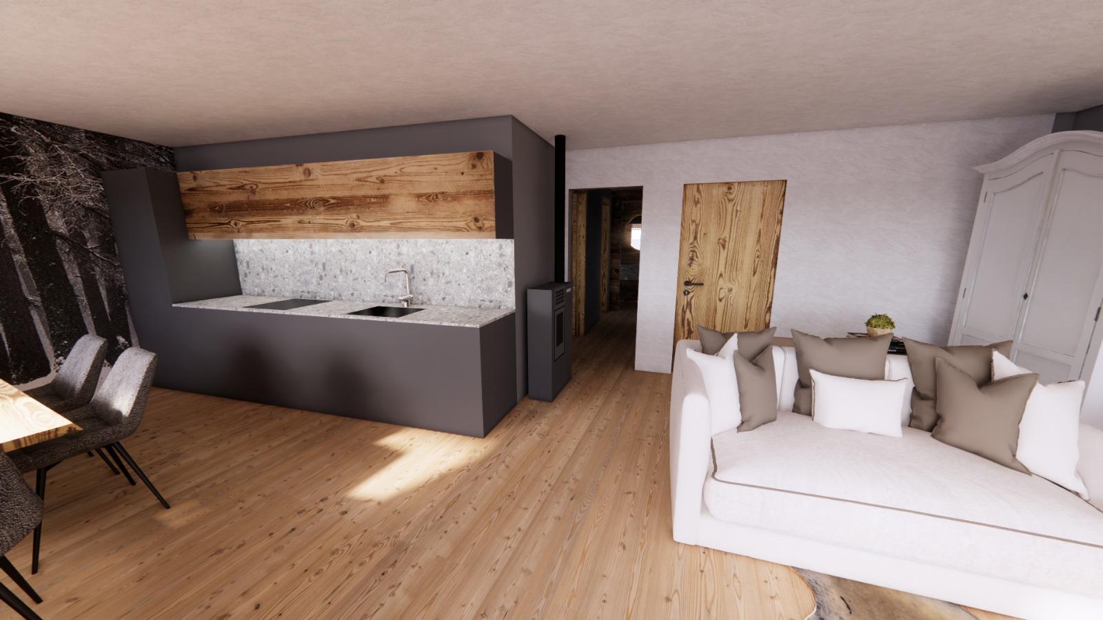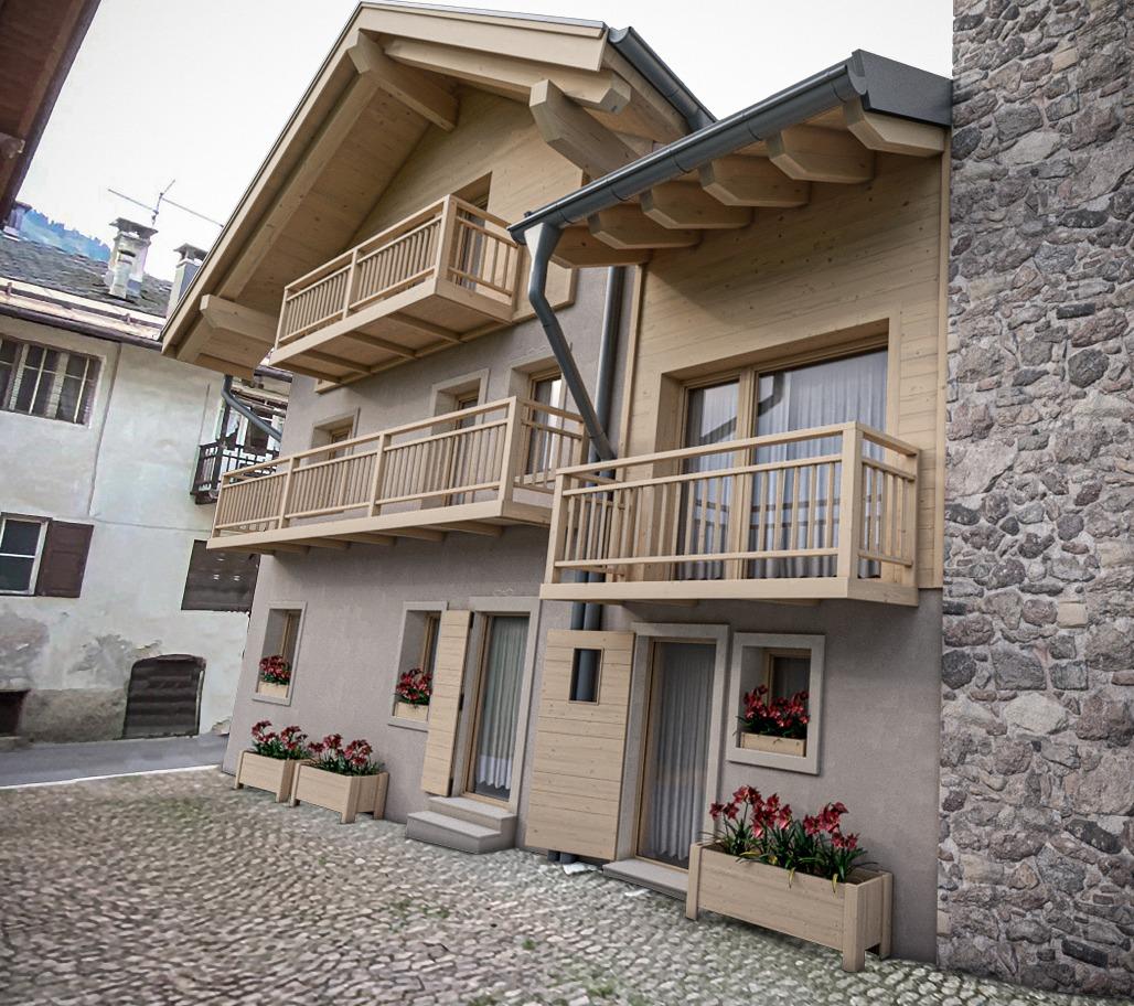 L’appartamento misura 89mq commerciali e comprende cucina con ampio soggiorno, 2 stanze da letto di cui 1 matrimoniale e 1 doppia; un bagno, con la possibilità di svilupparne un secondo se richiesto; ripostiglio e cantina esclusiva a piano terra. L’abitazione approfitta anche di un poggiolo in legno esposto a sud, meraviglioso affaccio sulle vie del paese.