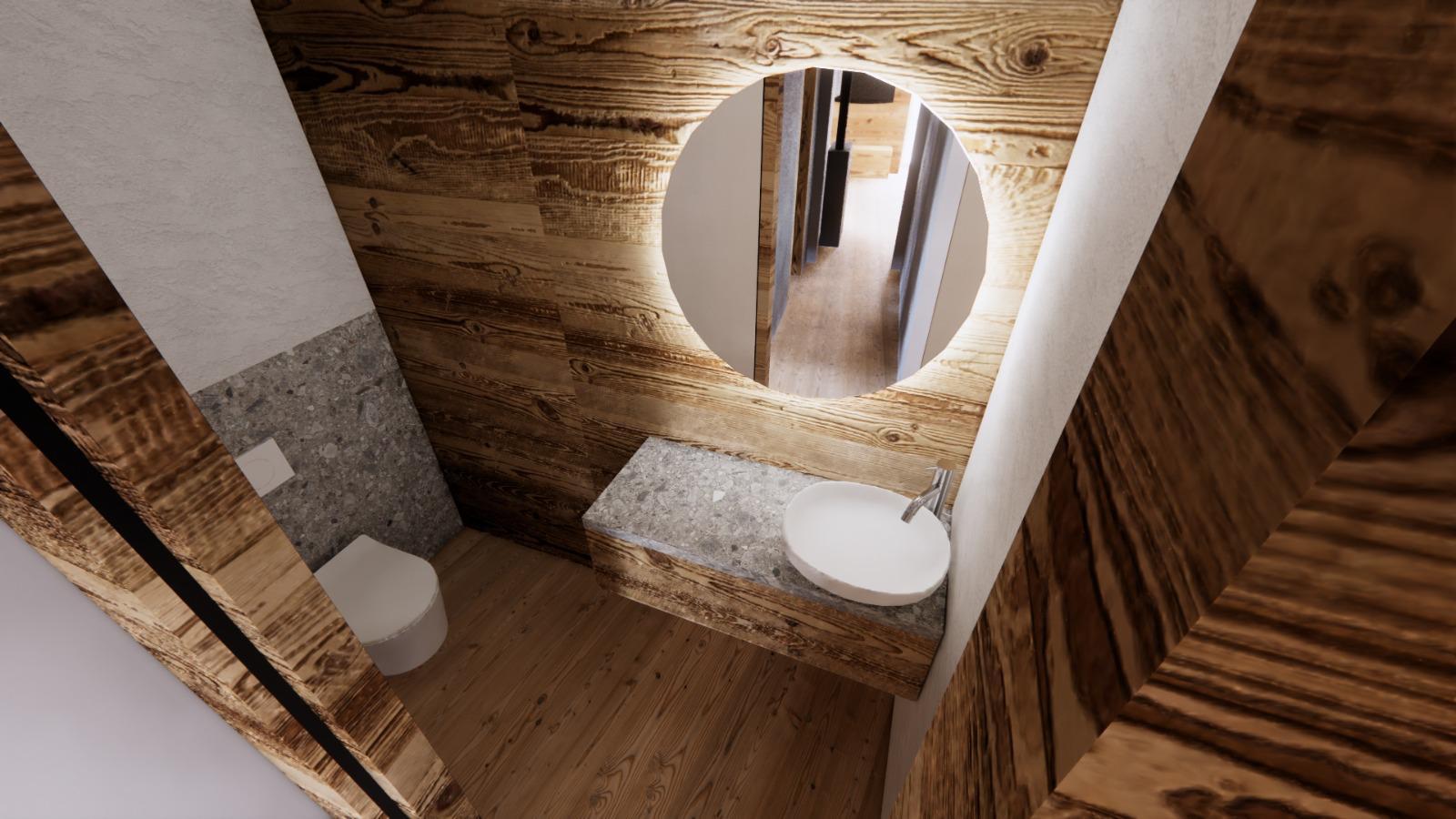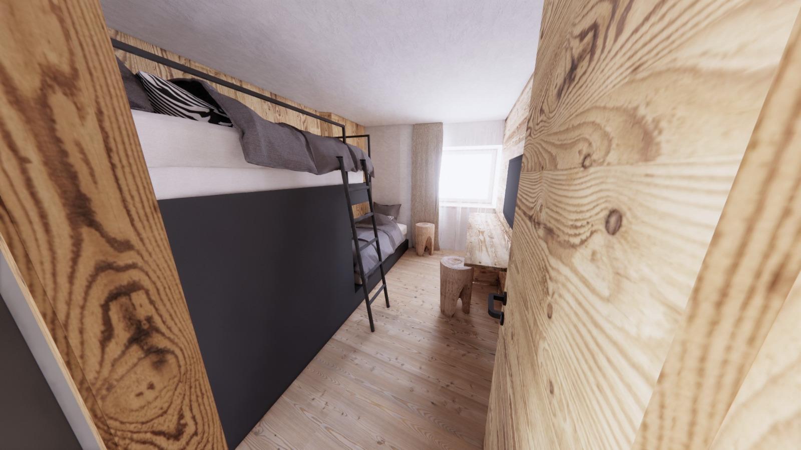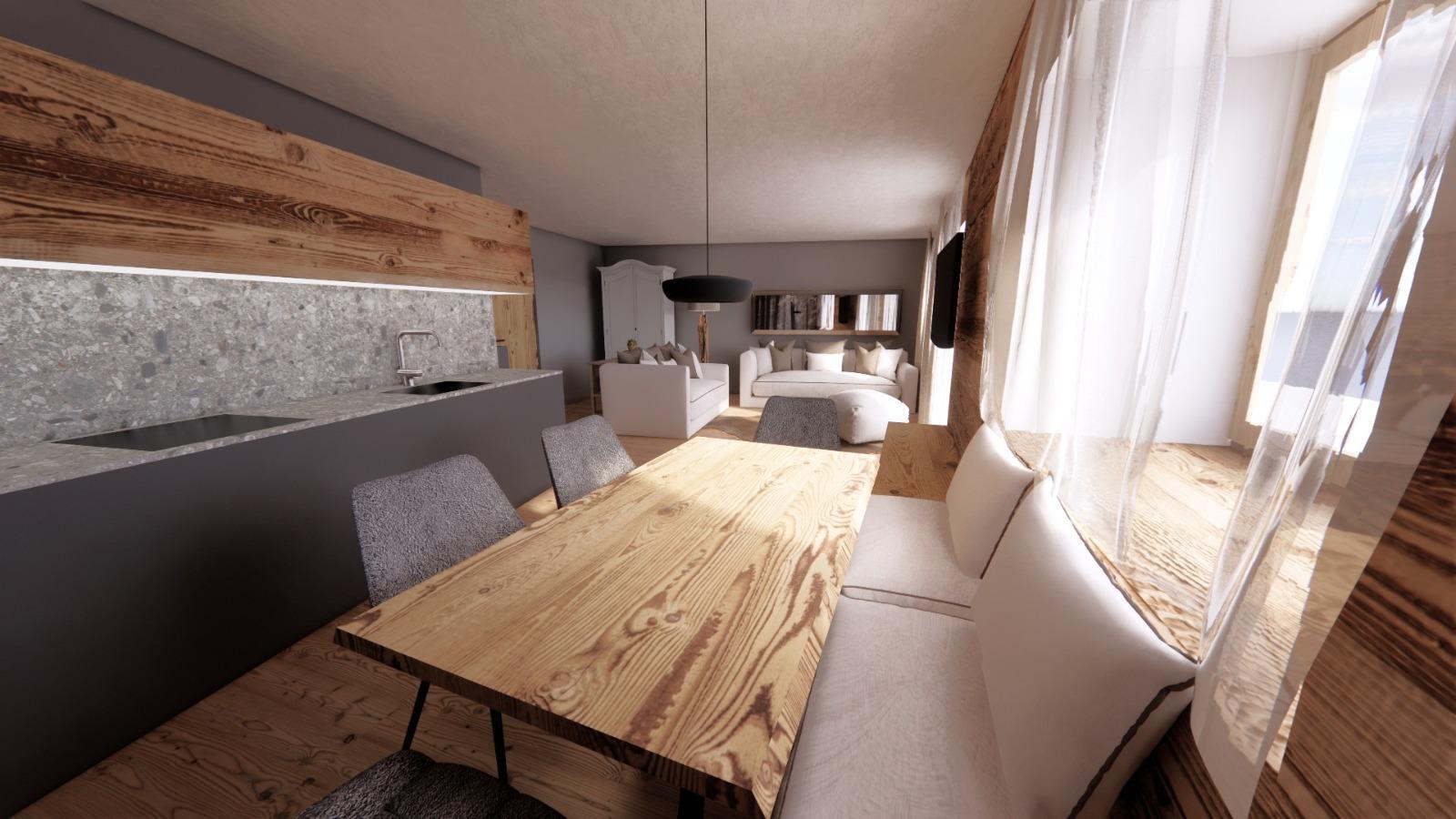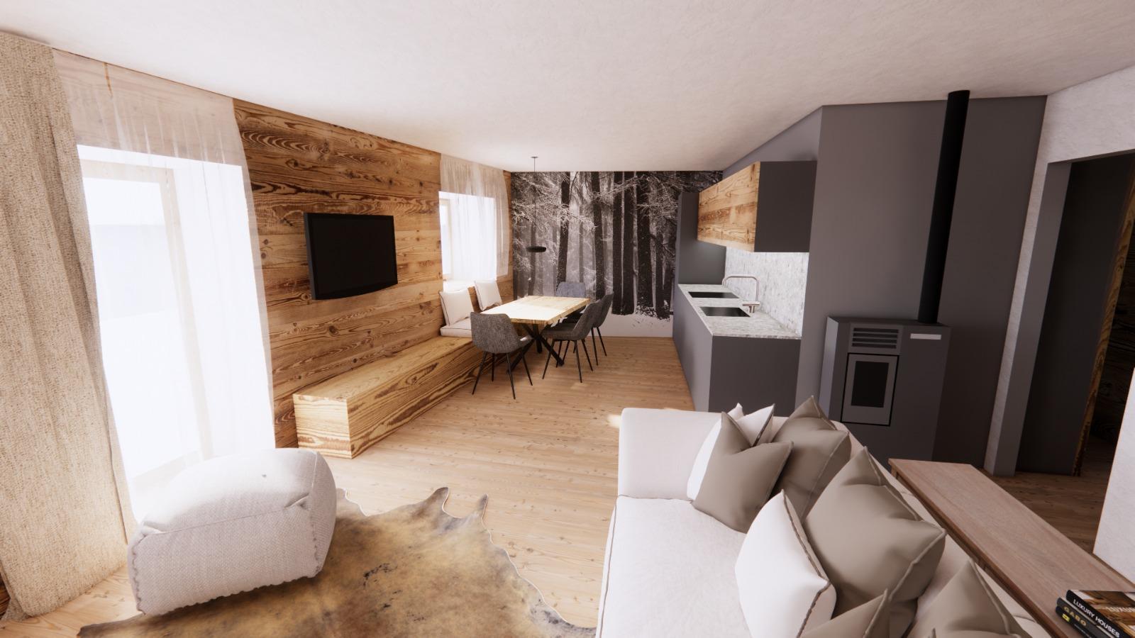 Le finiture in legno dell’appartamento creano un’atmosfera calorosa e tradizionale che si sposa a meraviglia con il contesto paesano e rustico trentino, pur mantenendo ottimi standard di modernità e comodità.