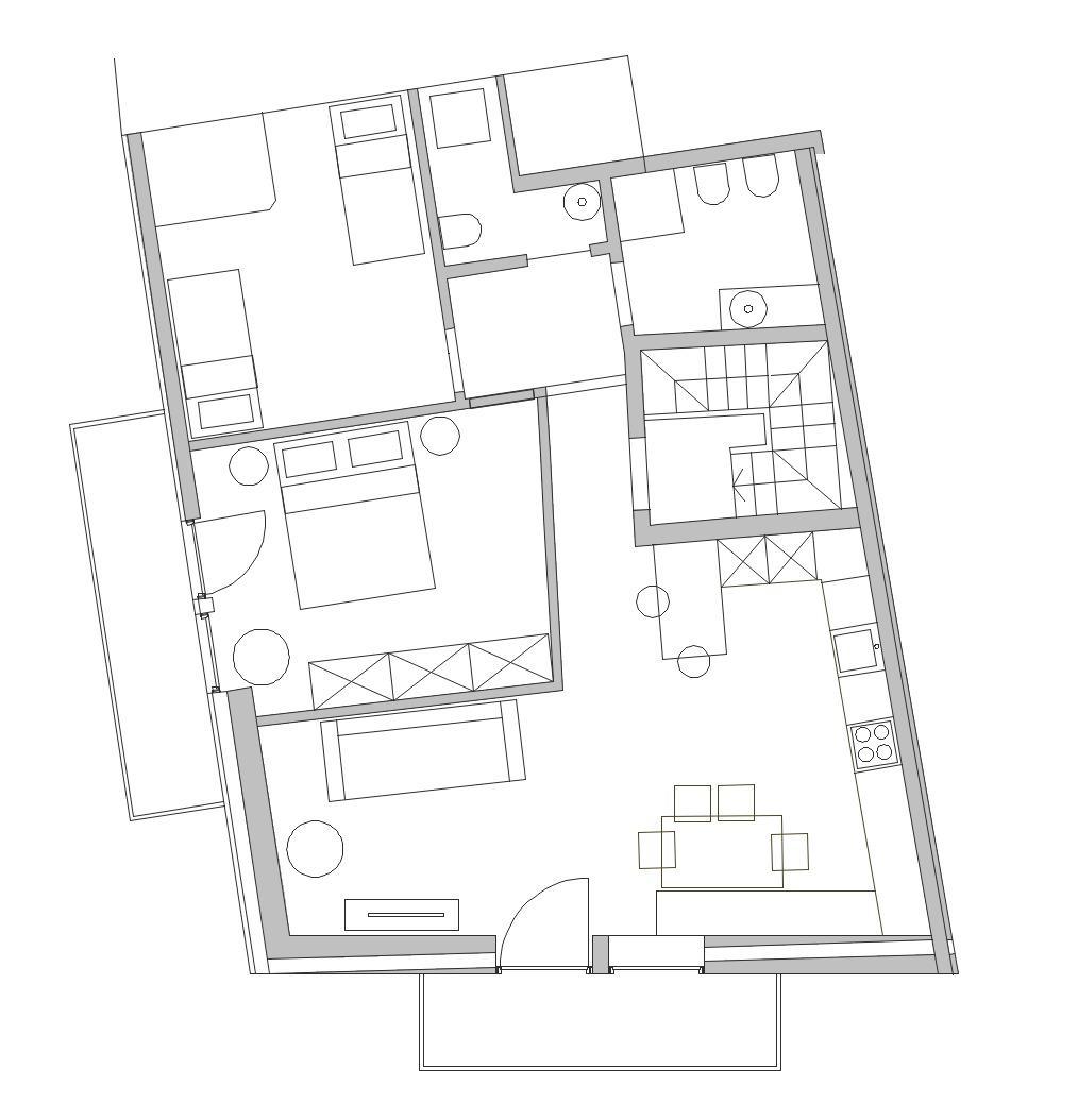 L’appartamento misura 92 mq commerciali e comprende cucina e soggiorno, due ampie stanze da letto matrimoniali; un bagno, con la possibilità di svilupparne un secondo se richiesto; ripostiglio e cantina esclusiva a piano terra. Ci sono ben due poggioli, uno esposto a sud e l’altro ad ovest, rendendo l’appartamento molto aperto e più luminoso anche grazie alla sua altezza.